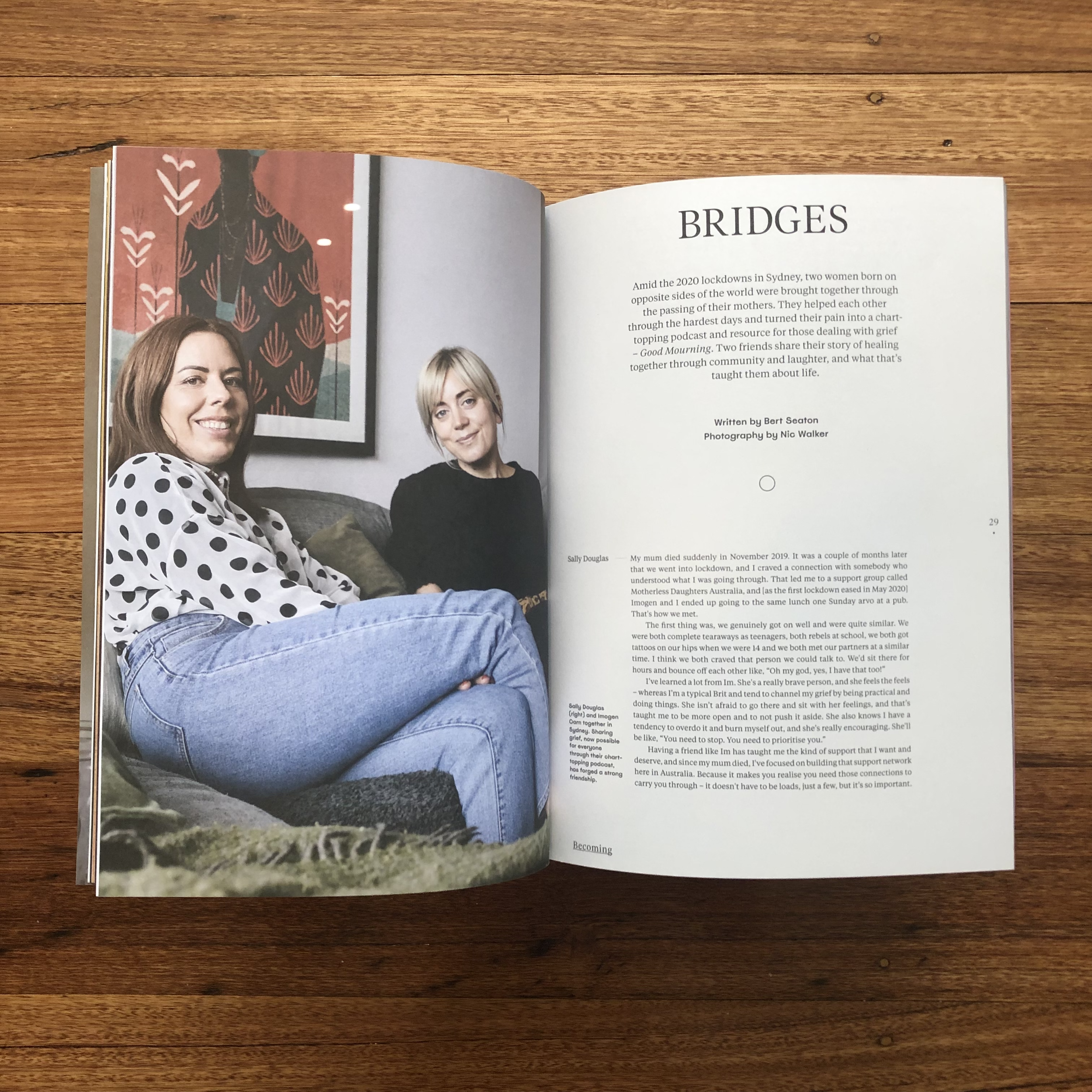 She went to the Botanic Gardens to scatter her mum’s ashes, and she was pouring it onto the flowers, and she said it was this thick, chalky, bath salt stuff, and that it was just sitting on top of the flowers. She was trying to push it in with her foot and people were walking past looking at her like, “What are you doing?” And she’s like, “I’m just scattering my dead mum on the flower bed.” We had a really good laugh at that, and I thought, at least we can laugh about this stuff, because if we can’t laugh at it, what’s the point?